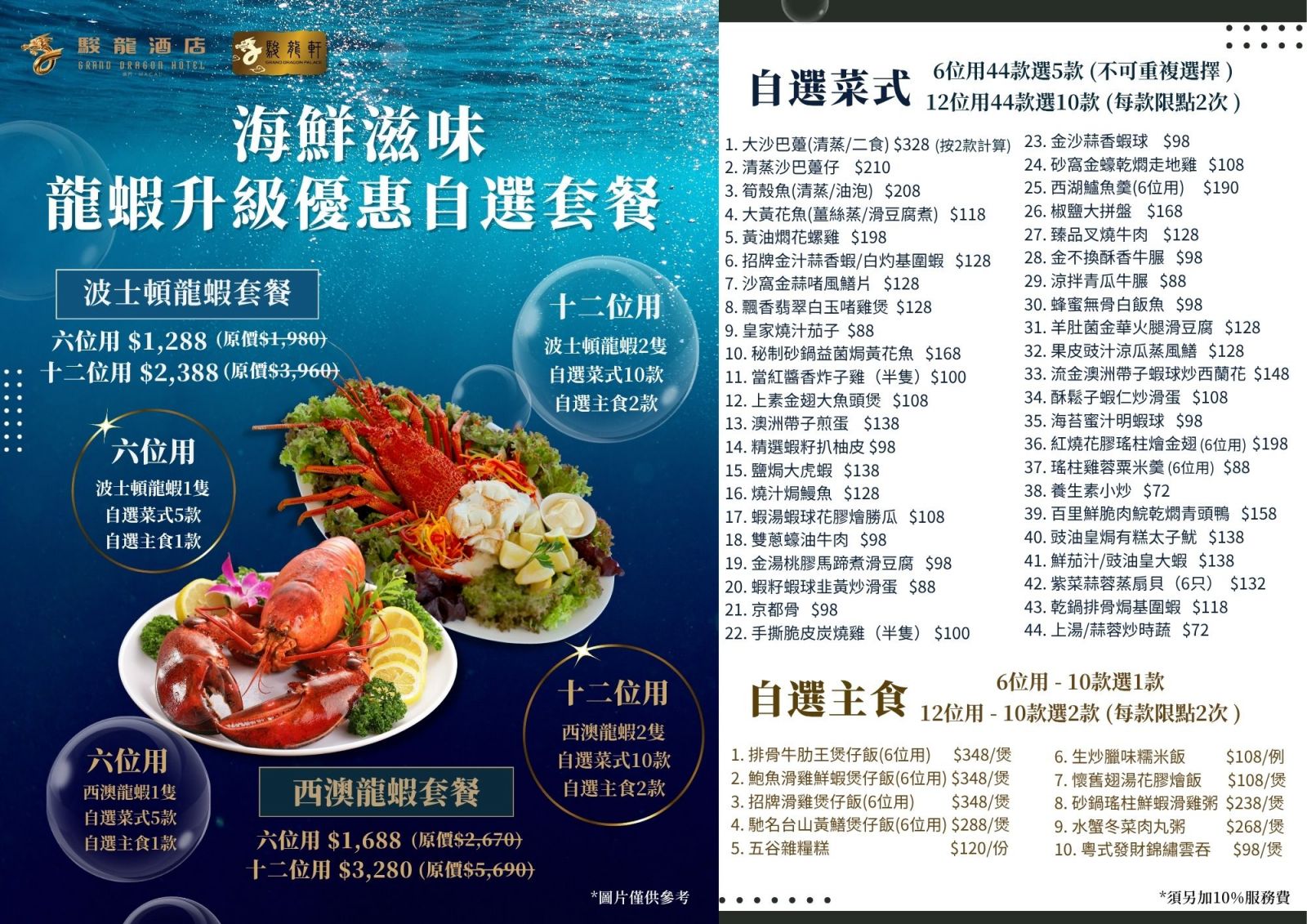 「頂鮮龍蝦滋味自選套餐」,無論6人或12 人套餐都能品嚐到西澳或波士頓龍蝦,鮮美肉質讓人垂涎欲滴,再自行搭配菜式及主食,款式高達44款,充分展現海鮮的多樣風味,與鮮甜海鮮相得益彰!