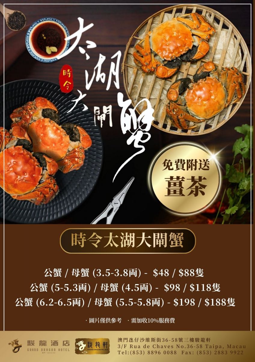 中國著名的美食之一,以其肉質鮮美和豐厚的 蟹黃而聞名的太湖大閘蟹,深受食客喜愛。駿龍軒 於今個時令專承挑選, 香濃的蟹黃蟹肉及豐滿鮮嫩的蟹膏,再搭配醬油或醋,品味其味道極佳的細膩蟹肉。現惠顧即免費附送薑茶!